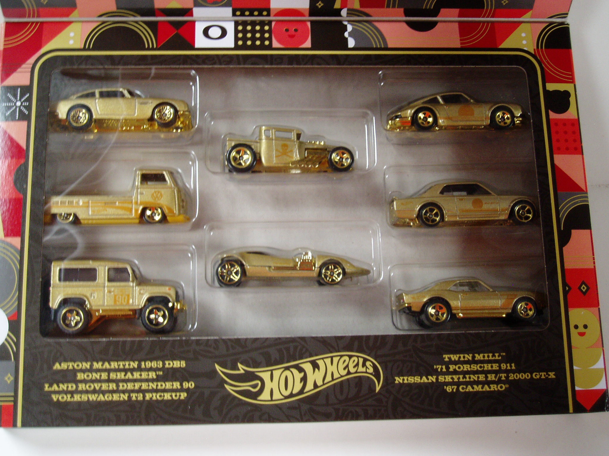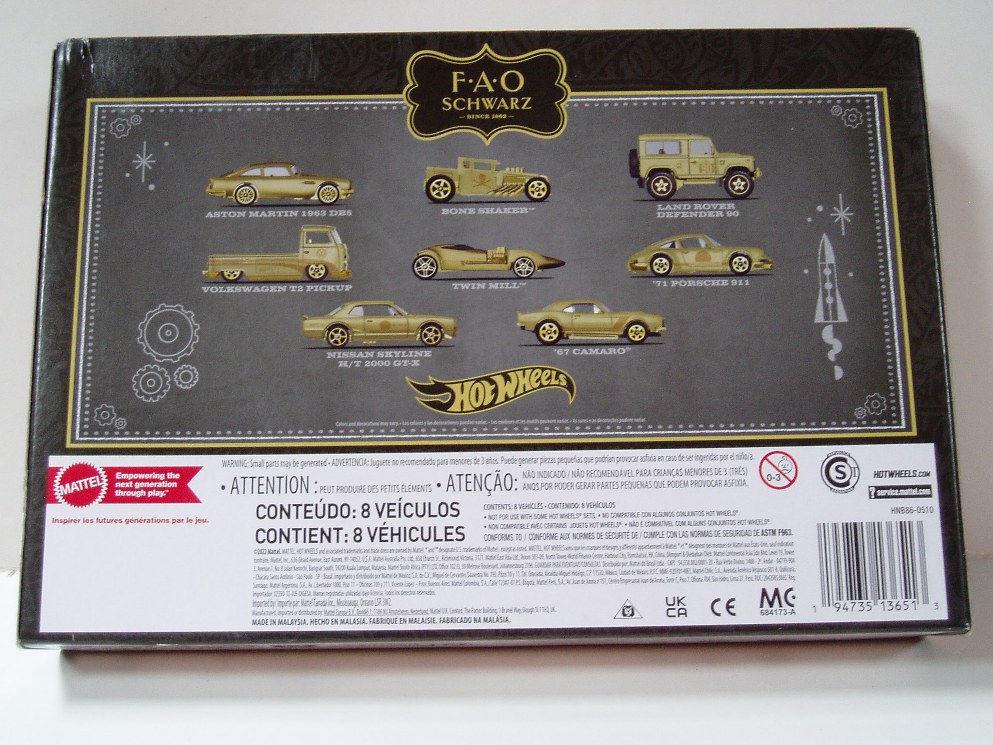 Hot Wheels 2022 F.A.O Schwarz gold cars set of 8. Aston Martin 1963 DB5. Bone shaker. Land rover defender 90. Volkswagen T2 pick up. Twin mill. 71 Porsche 911. Nissan skyline H/T 2000 GT-X and 67 Camaro. With so much commitment time and effort have been invested to create these very fine diecast cars, they have been crafted with extreme attention to detail, generously well balanced and sensationally presented.
